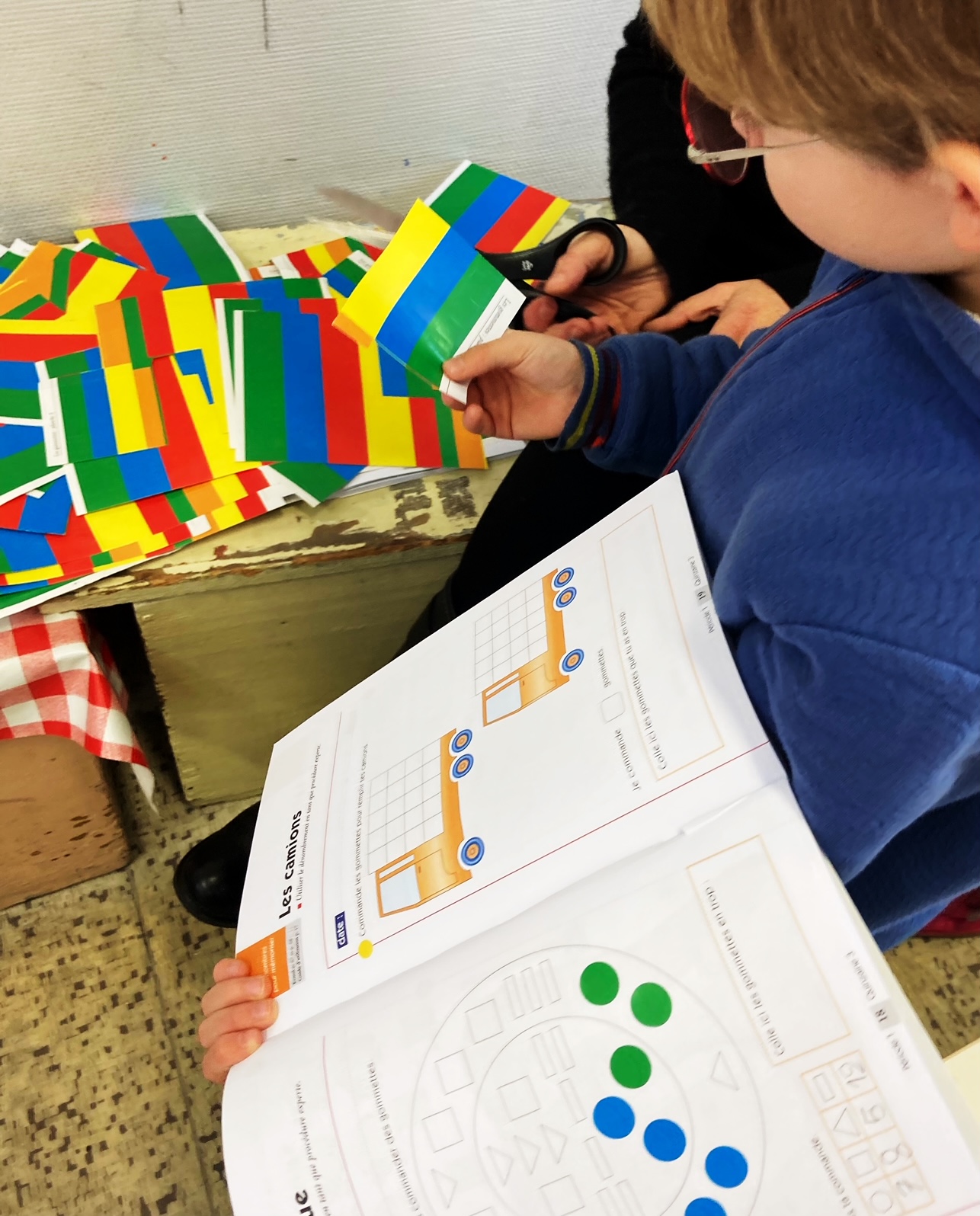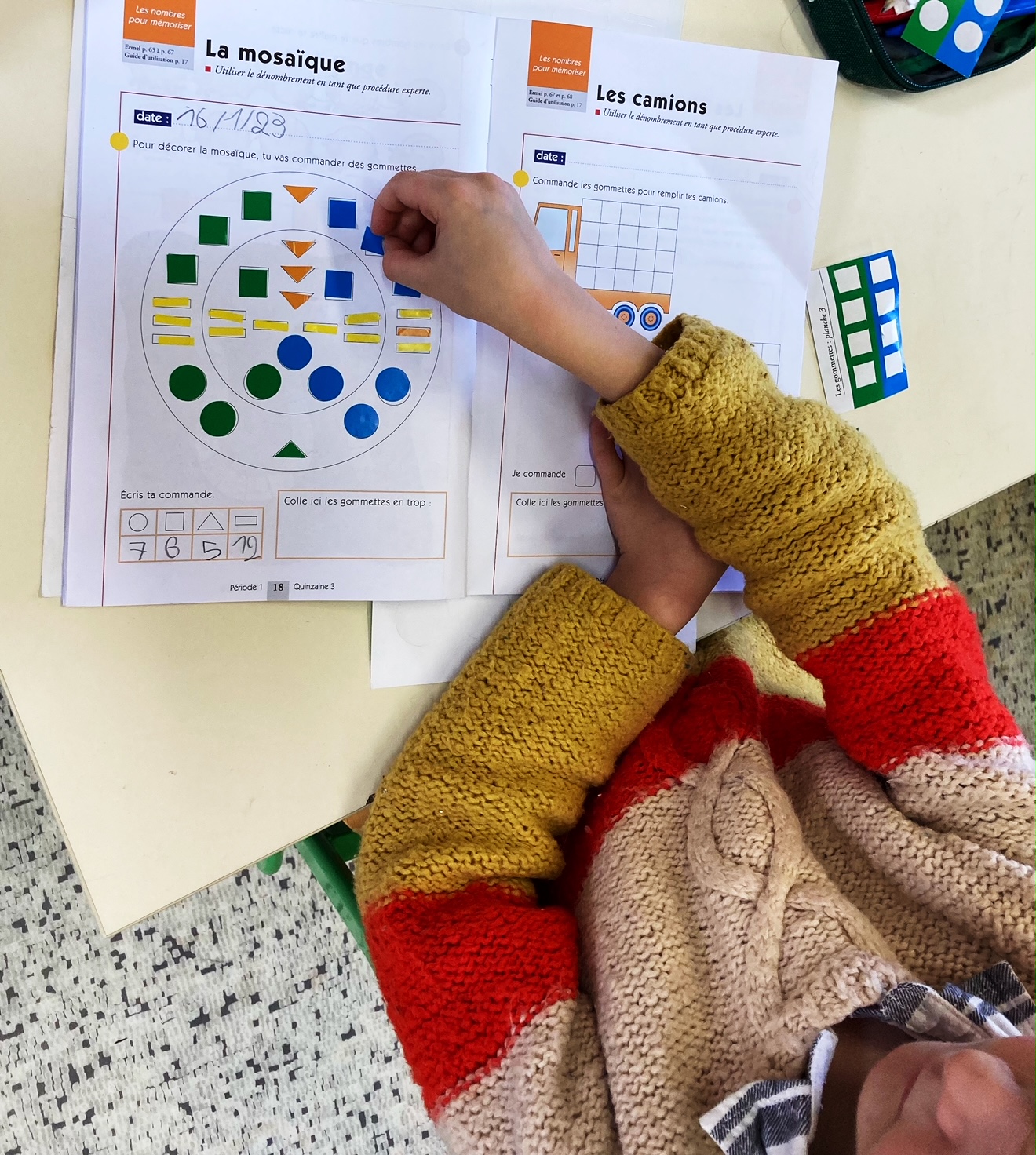 En CP on prend conscience que les nombres sont des outils efficaces pour mémoriser les quantités. On travaille sur les mosaïques. On pointe les figures, on compte le bon nombre, on compare avec son voisin et on va chercher le bon nombre de gommettes pour les coller sur notre mosaïque.