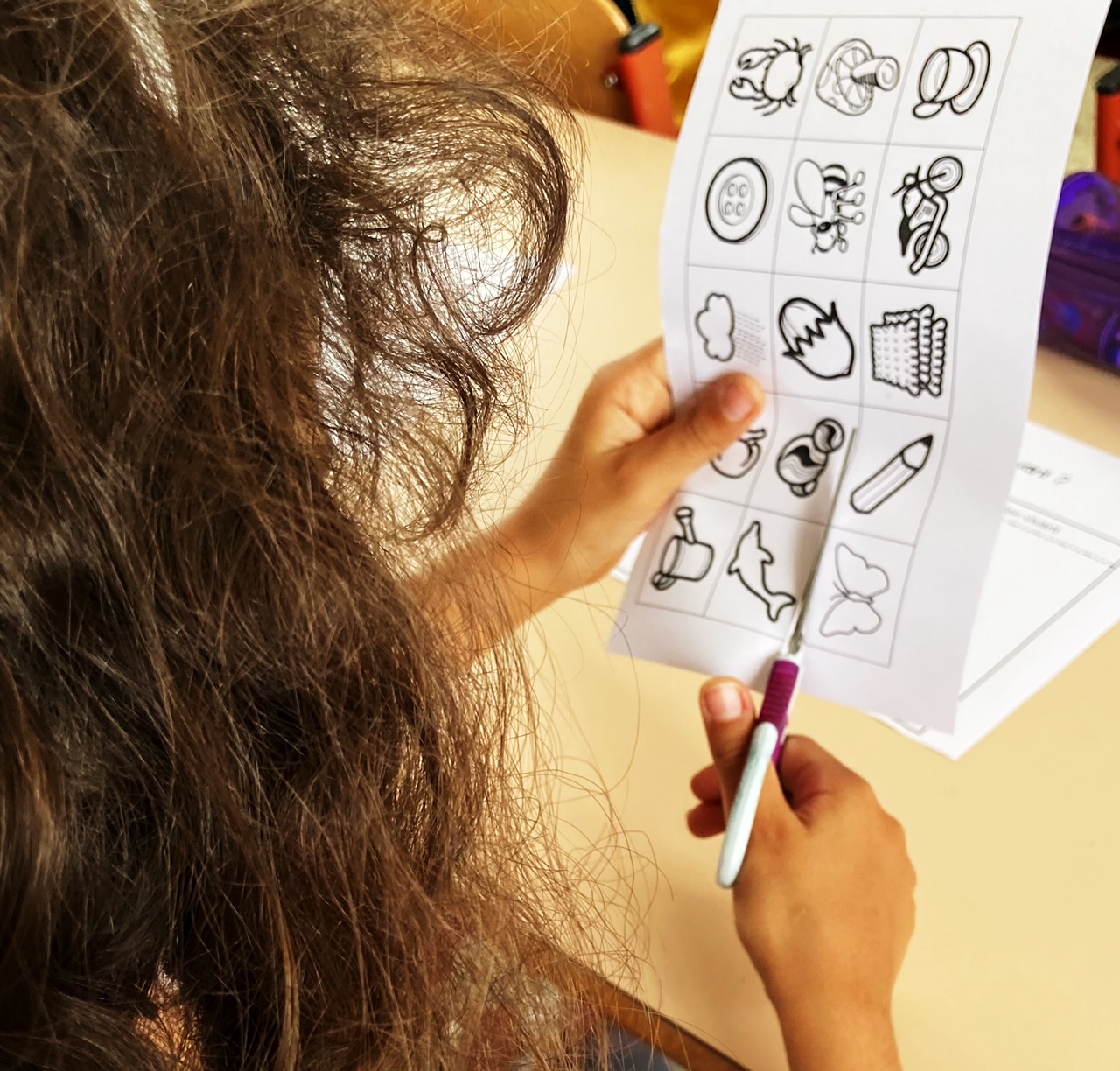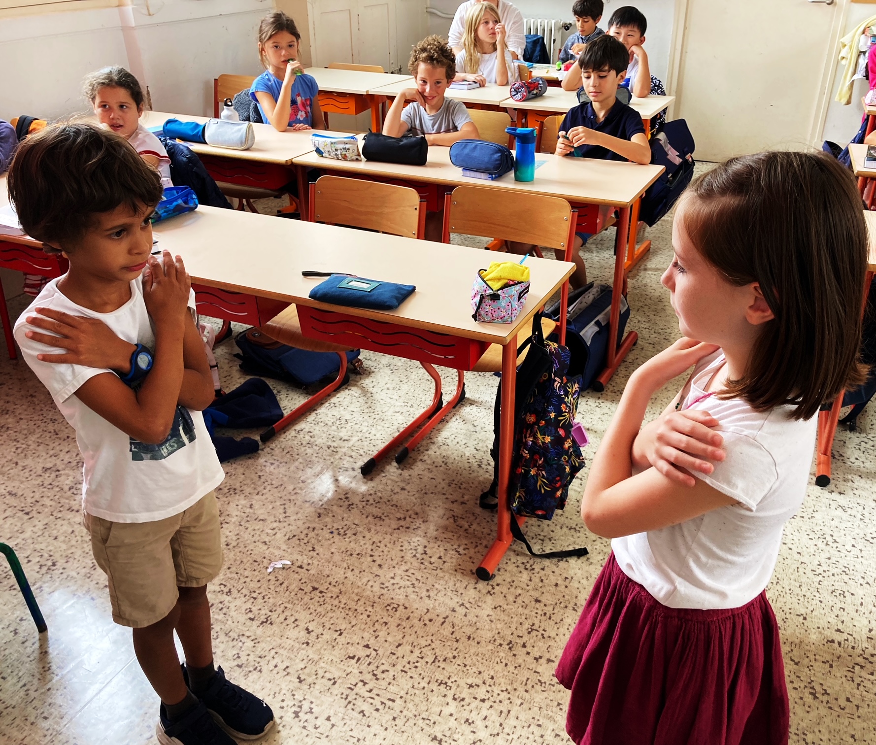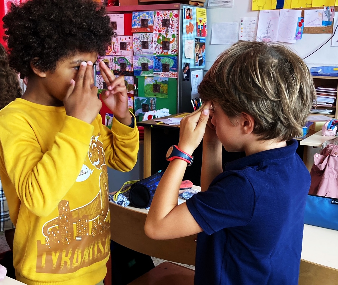 Le jeu du “miroir, miroir” avec notre “maîtresse coup de pouce” nous a bien aidé à comprendre!